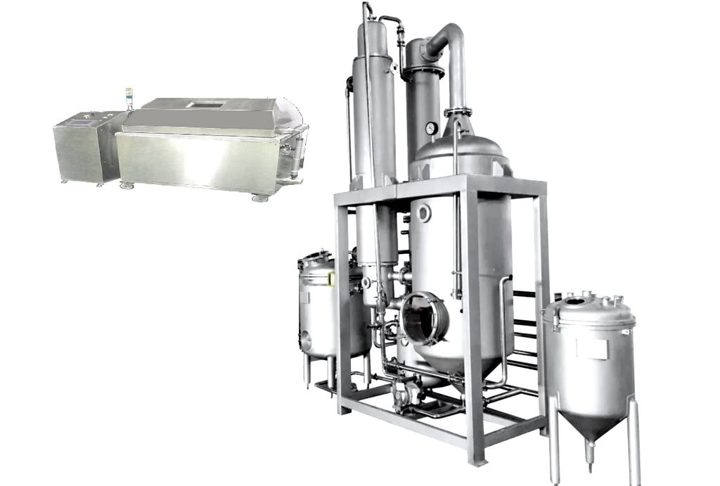 Извлечение растворителями (вода, спирт, пропиленгликоль, масло), грубая и тонкая очистка от твердых частиц, бережное упаривание экстрактов под вакуумом при температуре 42-45°С. Повышение содержание сухих веществ в экстрактах. Производство густых экстрактов. Отгонка и раздельный сбор конденсата высокой спиртуозности в индивидуальную емкость. Отгонка и раздельный сбор водяного конденсата в индивидуальную емкость. |